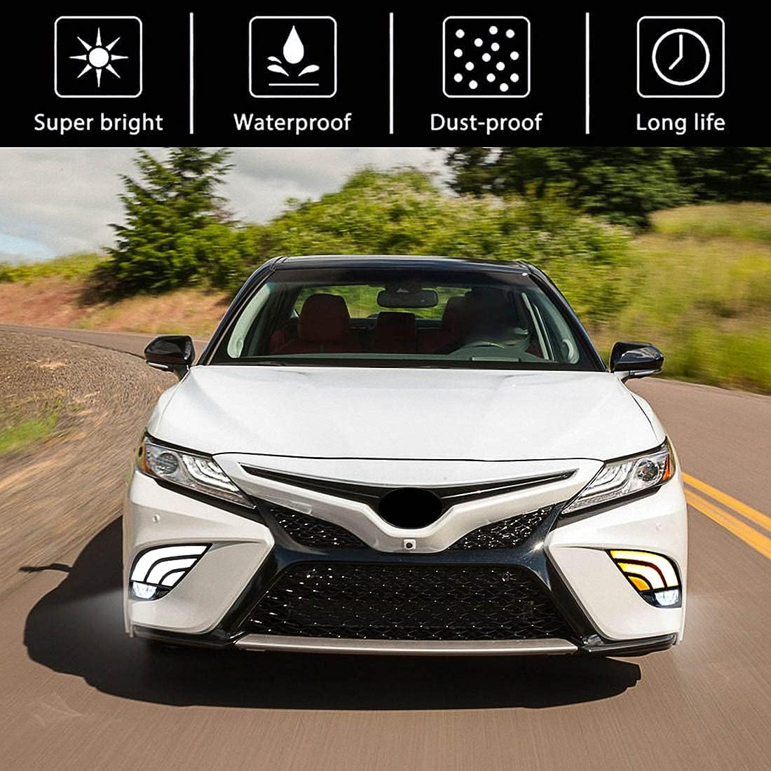 For Toyota Camry SE XSE 2018 2019 2020 LED Daytime Running Lights Kit with LED Fog Lamp Bulbs Specification: Daytime Running Light: Material: ABS Housing+High Quality LED+PC Lens Light Source Type: LED Light Color: White/Amber Yellow/Ice Blue Working Voltage: DC 12V Color Temperature: 6000K Working Temperature: -40℃-60℃ Wires Connection: - Black for Negative + Red for DRL Positive + Blue for Headlight Positive + Yellow for Turn Signal Positive LED Fog Lamp Bulb: Material: ABS Housing+PC Lens+Metal Heat Sink Light Color: White Color Temperature: 6000K Voltage: 12V / Wattage: 5.9W Reference Part Number : 81210-48050 / 81220-48050 Installation location: Front L/R of the car body. NOTE: Before you place an order, please make sure this light is fit for your car. Fit for Toyota Camry SE XSE 2018 2019 2020 4-Door Sedan model. (Do not fit for L/LE/XLE models ) Professionals install is strongly recommended to avoid trouble caused by inexperienced installer. The installation instructions are not included in the box. Contact seller if you need help.To add a futuristic touch to your brand new car, look to the sport style switchback LED DRL turn signal lights! Features: Bright LED Beads inside. Low power consumption. With plug, easy to be connected. Waterproof, Dust proof, Shock-resistant. Driving more safety in foggy, snow and rainy days. With reverse polarity protection and open circuit protection Package Include: 1 Pair LED Daytime Running Lights (Left/Right) 1 Pair LED Fog Lamp Bulbs(Left/Right) 2 Set Wiring Harness 1 Switch + Relay Other Accessories